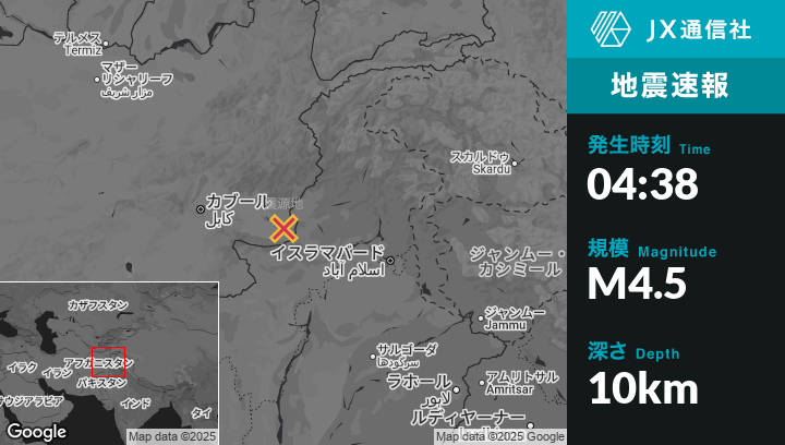 9月01日 04:38頃、アフガニスタンのBāsawulから北10kmの地点でM4.5の地震がありました。