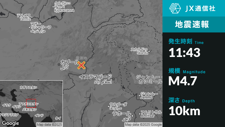 9月01日 11:43頃、アフガニスタンのJalālābādから北東35kmの地点でM4.7の地震がありました。