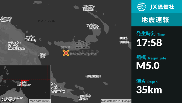 | 震源地 | パプアニューギニアのKandrianから南西29kmの地点 |
