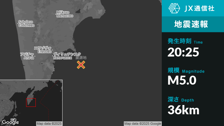 | 震源地 | ロシアのPetropavlovsk-Kamchatskyから東南東128kmの地点 |