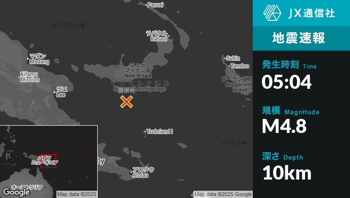 9月03日 05:04頃、パプアニューギニアのKandrianから南東120kmの地点でM4.8の地震がありました。