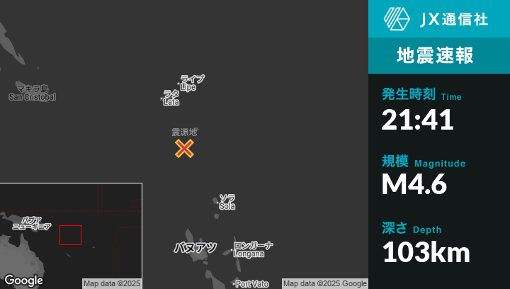 9月03日 21:41頃、ソロモン諸島のLataから南南東173kmの地点でM4.6の地震がありました。
