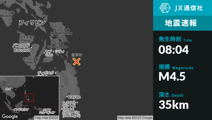 9月04日 08:04頃、フィリピンのUnionから東22kmの地点でM4.5の地震がありました。