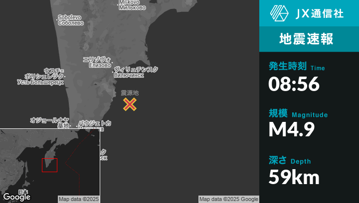 9月04日 08:56頃、ロシアのVilyuchinskから南南東100kmの地点でM4.9の地震がありました。