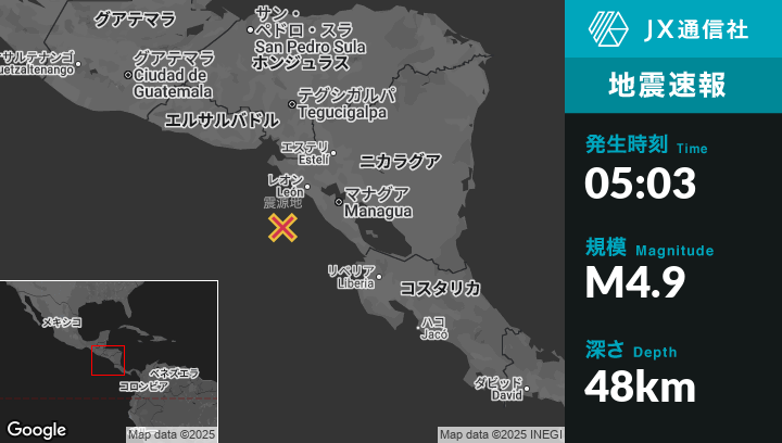 9月05日 05:03頃、ニカラグアのCorintoから南南西85kmの地点でM4.9の地震がありました。