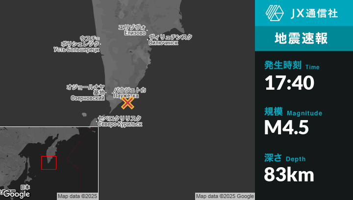9月07日 17:40頃、ロシアのOzernovskiyから東南東74kmの地点でM4.5の地震がありました。