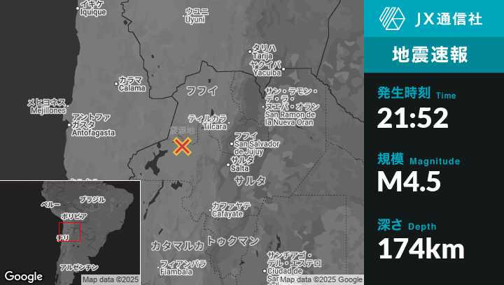 | 震源地 | アルゼンチンのSan Antonio de los Cobresから西55kmの地点 |