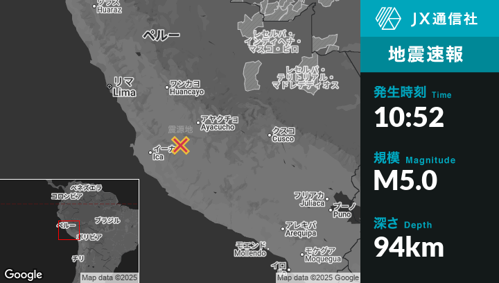 9月15日 10:52頃、ペルーのVilcanchosから西南西31kmの地点でM5.0の地震がありました。