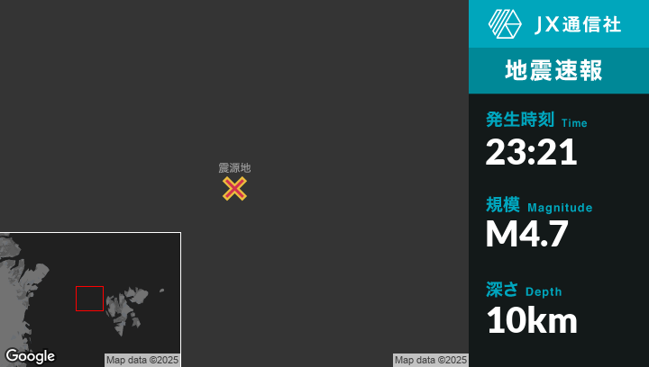 | 震源地 | スヴァールバル諸島とヤンマイエン島のLongyearbyenから西北西284kmの地点 |