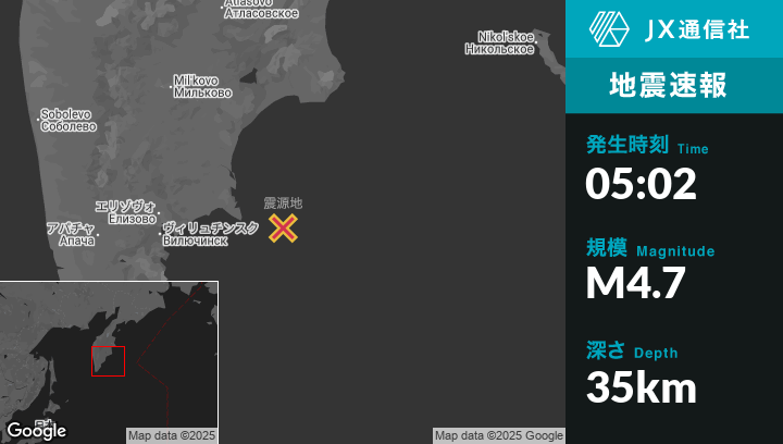 9月19日 05:02頃、ロシアのPetropavlovsk-Kamchatskyから東150kmの地点でM4.7の地震がありました。