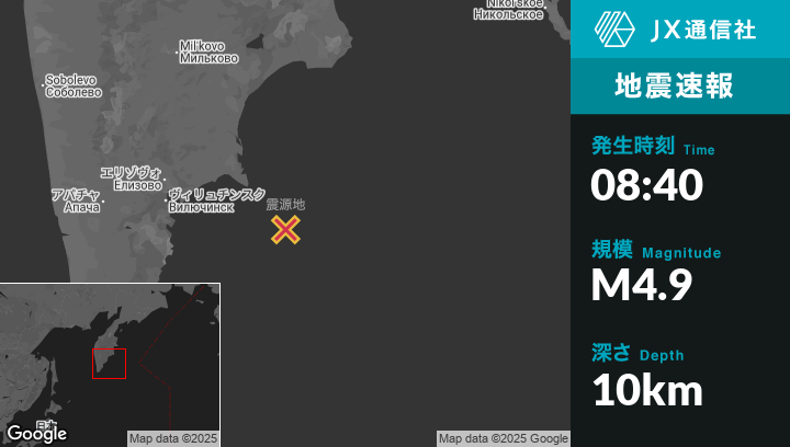 9月19日 08:40頃、ロシアのPetropavlovsk-Kamchatskyから東南東153kmの地点でM4.9の地震がありました。