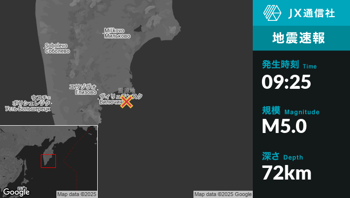 9月19日 09:25頃、ロシアのPetropavlovsk-Kamchatskyから東南東72kmの地点でM5.0の地震がありました。
