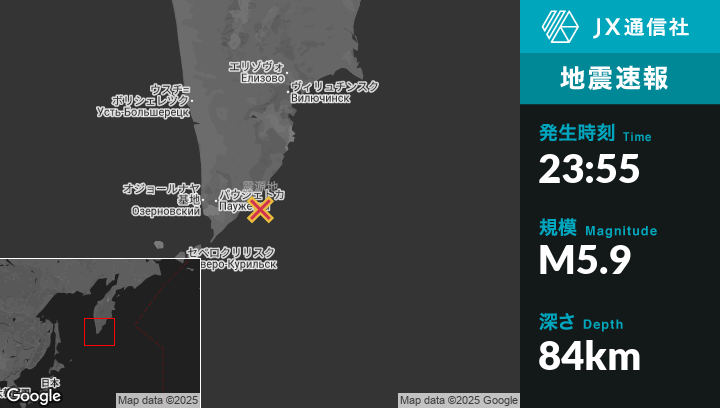 9月19日 23:55頃、ロシアのOzernovskiyから東90kmの地点でM5.9の地震がありました。