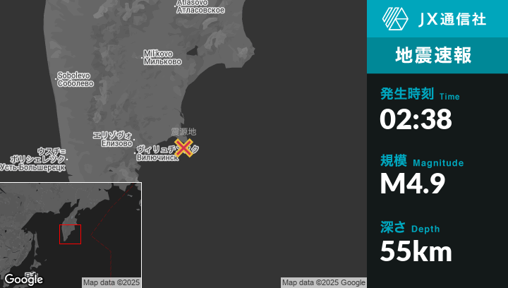 | 震源地 | ロシアのPetropavlovsk-Kamchatskyから東86kmの地点 |