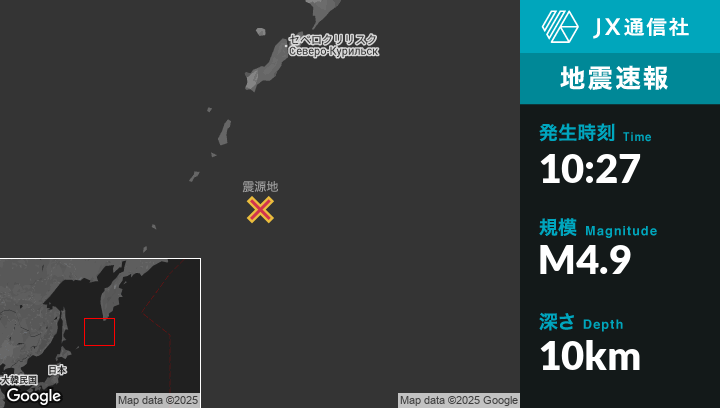 9月20日 10:27頃、ロシアのSevero-Kuril’skから南254kmの地点でM4.9の地震がありました。