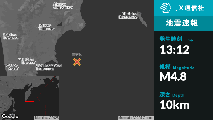 9月20日 13:12頃、ロシアのPetropavlovsk-Kamchatskyから東191kmの地点でM4.8の地震がありました。