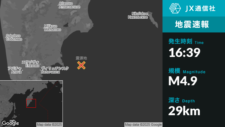 | 震源地 | ロシアのPetropavlovsk-Kamchatskyから東178kmの地点 |