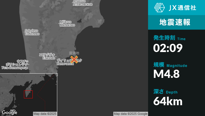 9月21日 02:09頃、ロシアのPetropavlovsk-Kamchatskyから東77kmの地点でM4.8の地震がありました。