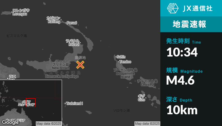 9月21日 10:34頃、パプアニューギニアのKokopoから南142kmの地点でM4.6の地震がありました。