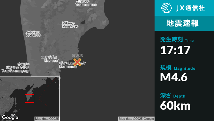 9月21日 17:17頃、ロシアのPetropavlovsk-Kamchatskyから東77kmの地点でM4.6の地震がありました。