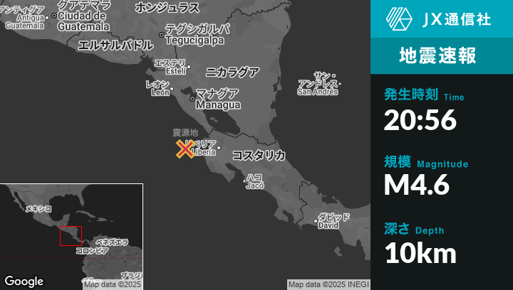 9月22日 20:56頃、コスタリカのTamarindoから北西83kmの地点でM4.6の地震がありました。