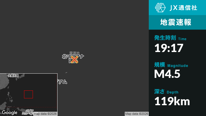 3月04日 19:17頃、北マリアナ諸島のSaipanから東北東9kmの地点でM4.5の地震がありました。