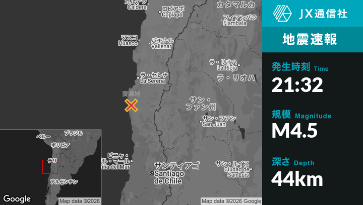 3月04日 21:32頃、チリのOvalleから南西43kmの地点でM4.5の地震がありました。