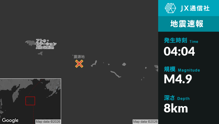 3月05日 04:04頃、アラスカのAttu Stationから東南東233kmの地点でM4.9の地震がありました。