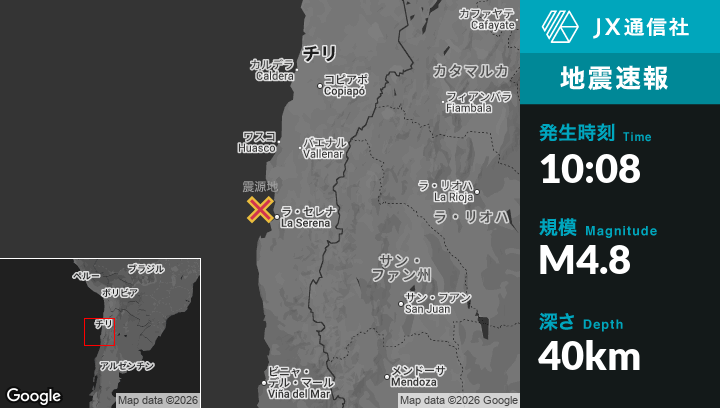 3月05日 10:08頃、チリのCoquimboから北西43kmの地点でM4.8の地震がありました。