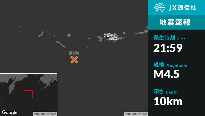 | 震源地 | アラスカのAdakから西南西259kmの地点 |