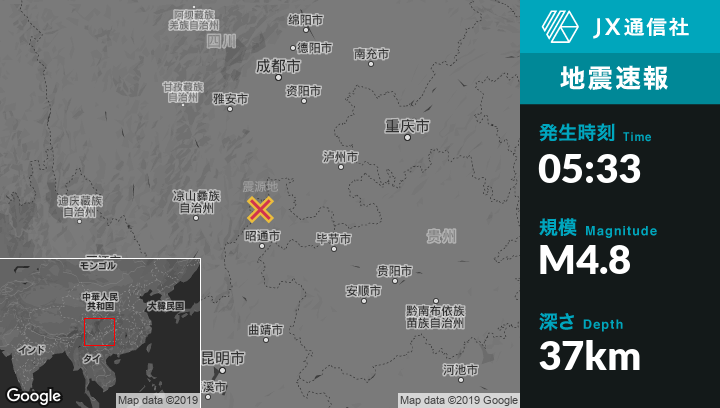 5月16日 05:33頃、中国のXiluoduから東南東9kmの地点でM4.8の地震がありました。