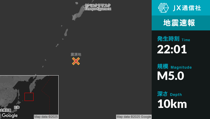 | 震源地 | ロシアのSevero-Kuril’skから南289kmの地点 |