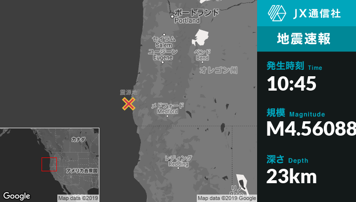 11月30日 10:45頃、オレゴンのPort Orfordから北西10kmの地点でM4.56088972091675の地震がありました。