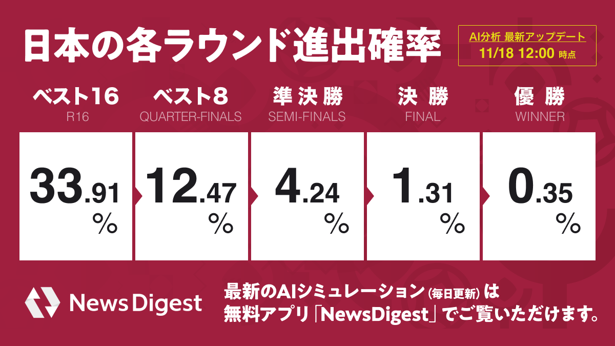日本代表は、グループリーグでドイツ代表(日本時間23日22時キックオフ)、コスタリカ代表(同27日19時キックオフ)、スペイン代表(同2日4時キックオフ)と対戦し、上位2ヶ国が進出できるノックアウトステージを目指します。初戦となるドイツ戦における日本代表の勝率は26.1%、コスタリカ戦では43.1%、スペイン戦では21.8%となっており、ノックアウトステージに進出できる確率は33.9%でした。