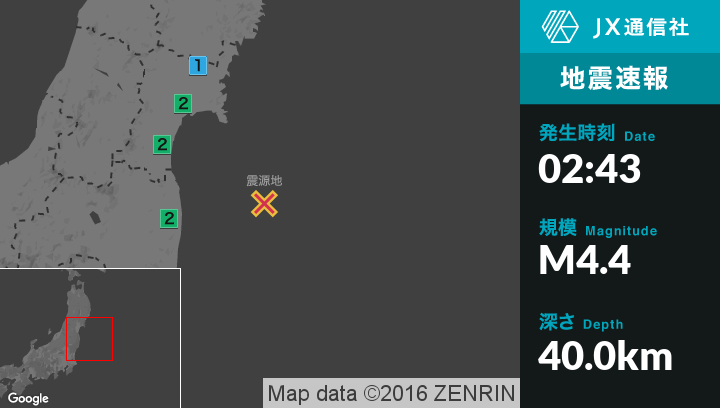 | 震度2 | 宮城県南部, 宮城県中部, 福島県浜通り |
