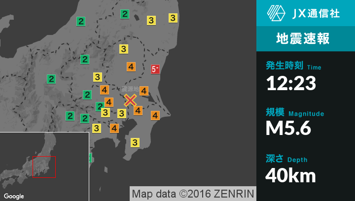 | 震度4 | 茨城県南部, 栃木県南部, 埼玉県北部, 埼玉県南部, 千葉県北東部, 千葉県北西部, 神奈川県東部 |