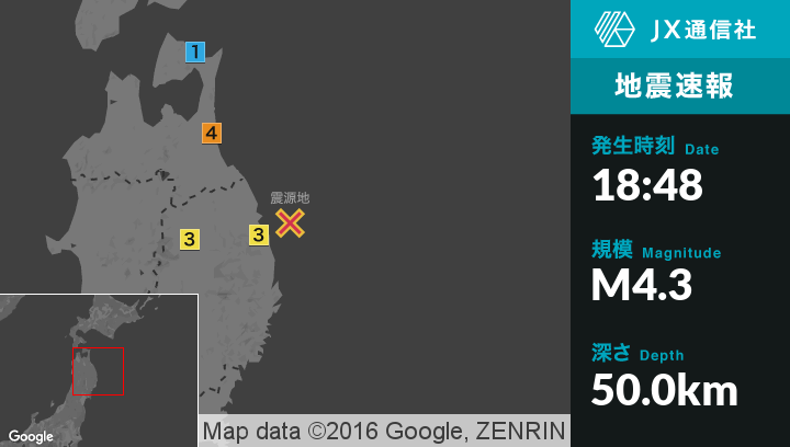 | 震度1 | 青森県下北, 岩手県沿岸南部, 岩手県内陸南部, 渡島地方東部, 秋田県内陸南部 |