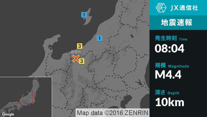 | 震度2 | 糸魚川市, 妙高市, 長野市, 大町市, 白馬村, 信濃町, 小川村, 黒部市 |