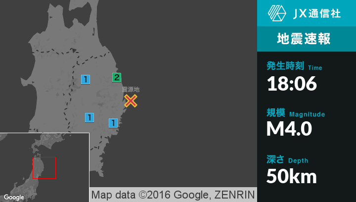 | 震度1 | 久慈市, 岩泉町, 田野畑村, 普代村, 岩手洋野町, 大船渡市, 釜石市, 住田町, 大槌町, 盛岡市, 八幡平市, 葛巻町, 遠野市, 一関市, 八戸市, 五戸町, 青森南部町, 階上町, 気仙沼市 |