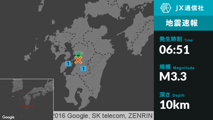 | 震度1 | 熊本西区, 宇土市, 甲佐町, 五木村, 球磨村, 上天草市 |