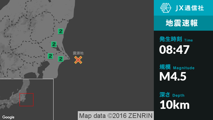 | 震度2 | 笠間市, 取手市, 潮来市, 稲敷市, 神栖市, 鉾田市, 銚子市, 旭市, 香取市, 山武市, 芝山町, 長南町, 成田市 |