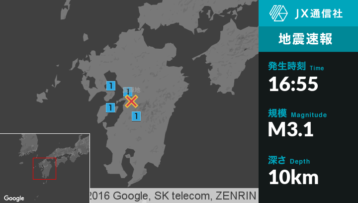 | 震度1 | 南島原市, 八代市, 宇城市, 氷川町, 球磨村, 上天草市, 芦北町 |