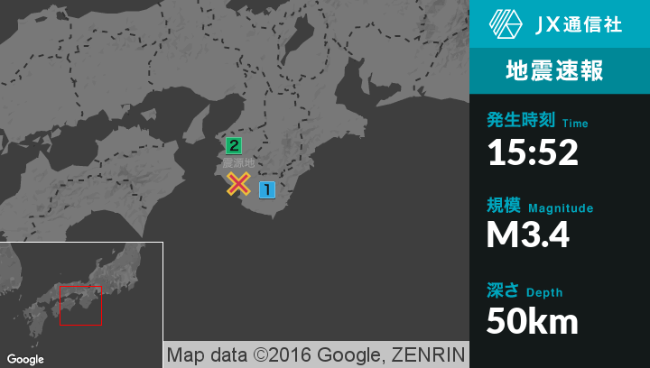 | 震度1 | 御坊市, 湯浅町, 日高川町, 田辺市, 白浜町 |
