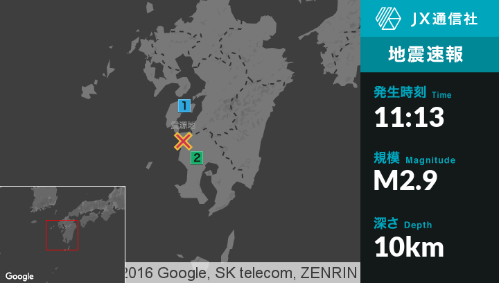 | 震度1 | 薩摩川内市, さつま町, 長島町, 水俣市 |