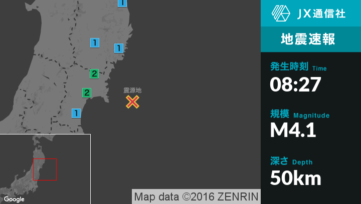 | 震度1 | 登米市, 栗原市, 大崎市, 涌谷町, 宮城美里町, 南三陸町, 仙台青葉区, 仙台宮城野区, 仙台若林区, 仙台泉区, 東松島市, 松島町, 七ヶ浜町, 大衡村, 名取市, 岩沼市, 蔵王町, 宮城川崎町, 宮古市, 大船渡市, 陸前高田市, 釜石市, 住田町, 北上市, 遠野市, 一関市, 奥州市, 福島伊達市, 南相馬市, 飯舘村 |