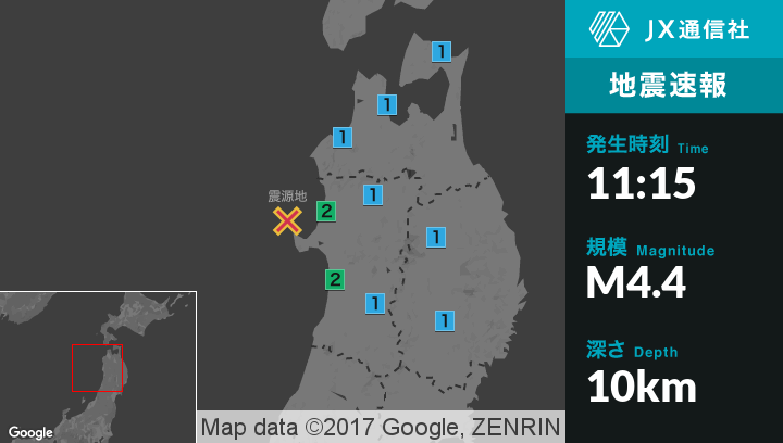 | 震度1 | 藤里町, 八峰町, 五城目町, 大館市, 北秋田市, 小坂町, 上小阿仁村, 湯沢市, 仙北市, 秋田美郷町, 羽後町, 東成瀬村, 五所川原市, つがる市, 今別町, 外ヶ浜町, 深浦町, 西目屋村, 藤崎町, 田舎館村, 東通村, 二戸市, 矢巾町, 花巻市, 西和賀町 |