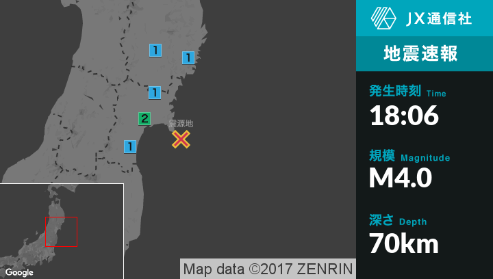 | 震度1 | 仙台青葉区, 塩竈市, 東松島市, 松島町, 大衡村, 気仙沼市, 登米市, 栗原市, 涌谷町, 岩沼市, 大船渡市, 住田町, 一関市 |