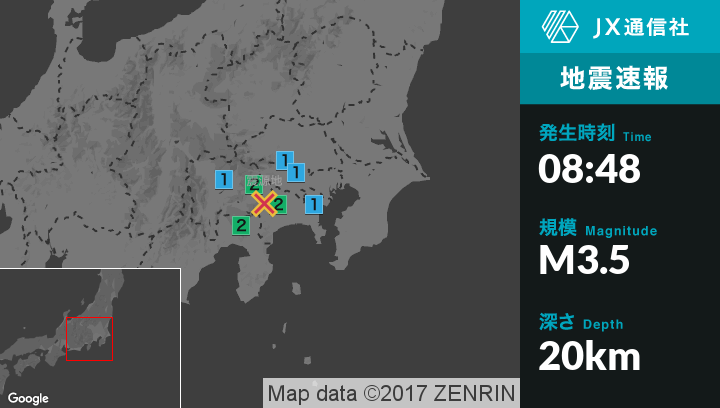 | 震度1 | 相模原緑区, 相模原中央区, 相模原南区, 秦野市, 厚木市, 伊勢原市, 南足柄市, 中井町, 松田町, 湯河原町, 清川村, 横浜旭区, 三浦市, 大磯町, 富士吉田市, 都留市, 道志村, 西桂町, 鳴沢村, 甲府市, 山梨北杜市, 笛吹市, 甲州市, 町田市, 日野市, 国分寺市, 檜原村 |