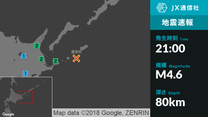 | 震度2 | 中標津町, 標津町, 別海町, 根室市 |