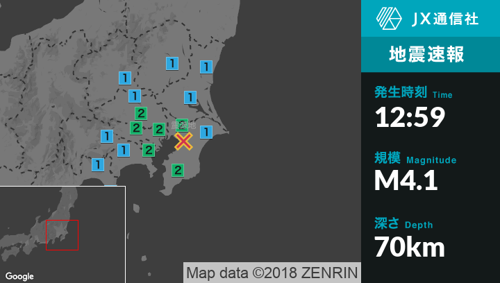| 震度2 | 草加市, 千葉中央区, 千葉花見川区, 船橋市, 富津市, 東京千代田区, 東京港区, 東京大田区, 東京渋谷区, 東京北区, 東京練馬区, 調布市, 町田市, 横浜鶴見区, 横浜神奈川区, 横浜保土ケ谷区, 横浜港北区, 横浜戸塚区, 横浜港南区, 横浜旭区, 横浜緑区, 横浜青葉区, 横浜都筑区, 川崎川崎区, 川崎中原区, 大和市 |
